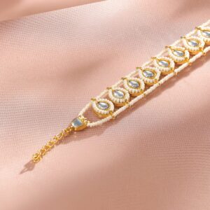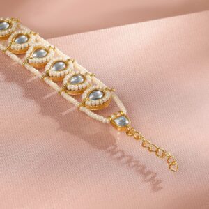 Bracelet : Crafted with 22K gold plating, this adjustable bracelet features intricate kundan settings and pearl embellishments. Its handcrafted design enhances traditional elegance, making it a timeless accessory for ethnic ensembles. Occasion : Bring your style to a whole new level with this handcrafted piece of jewellery. When you’re celebrating a special Occasion : – a birthday, wedding, or personal milestone – this piece adds that extra something that makes us feel special and looking our best. Material : & Care Dimension : Length : 14 cm, Width: 1.7 cm Net Weight: 15.64 g Net Quantity : 1 Bracelet Material :Brass Care Label : It is advisable to avoid contact with water and organic chemicals i.e. perfume sprays. Store jewellery in airtight box. After use, wipe the jewellery with soft cotton cloth.