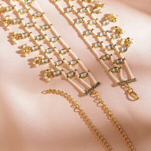 Saree Accessories : A handcrafted 22K gold-plated kamarband featuring intricate Kundan work with pearl embellishments, designed for a regal and elegant waist accessory. Occasion : Bring your style to a whole new level with this handcrafted piece of jewellery. When you’re celebrating a special Occasion : – a birthday, wedding, or personal milestone – this piece adds that extra something that makes us feel special and looking our best. Material : & Care Dimension : Length : 76 cm, Width: 4.5 cm Net Weight: 24.61 g Net Quantity : 1 Saree Accessories Material :Brass Care Label : It is advisable to avoid contact with water and organic chemicals i.e. perfume sprays. Store jewellery in airtight box. After use, wipe the jewellery with soft cotton cloth.