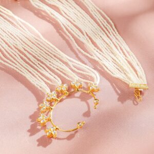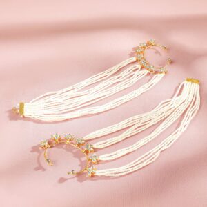 Earrings : Exquisite 22K gold-plated ear cuff earrings featuring kundan floral motifs and multi-strand pearl chains for a regal, statement look. Occasion : Bring your style to a whole new level with this handcrafted piece of jewellery. When you’re celebrating a special Occasion : – a birthday, wedding, or personal milestone – this piece adds that extra something that makes us feel special and looking our best. Material : & Care Dimension : Length : 20.cm, Width: 7 w Net Weight: 47.02 g Net Quantity : 1 Pair Of Earrings Material :Brass Care Label : It is advisable to avoid contact with water and organic chemicals i.e. perfume sprays. Store jewellery in airtight box. After use, wipe the jewellery with soft cotton cloth.