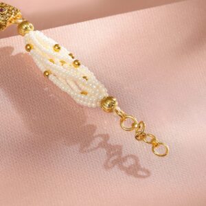 Bracelet : This 22K gold-plated bracelet showcases a regal blend of Kundan and ruby stones, set in a detailed panel with multiple strands of pearl beads. The intricate craftsmanship and traditional elegance make it a must-have accessory for festive and bridal wear. Occasion : Bring your style to a whole new level with this handcrafted piece of jewellery. When you’re celebrating a special Occasion : – a birthday, wedding, or personal milestone – this piece adds that extra something that makes us feel special and looking our best. Material : & Care Dimension : Length : 16 cm, Width: 1.5 cm Net Weight: 14.75 g Net Quantity : 1 Bracelet Material :Brass Care Label : It is advisable to avoid contact with water and organic chemicals i.e. perfume sprays. Store jewellery in airtight box. After use, wipe the jewellery with soft cotton cloth.