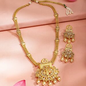 This exquisite ensemble features intricately crafted pendant and matching earrings, adorned with traditional motifs inspired by temple architecture. The regal elegance of Lord Krishna is beautifully captured in the design, showcasing his divine grace and spiritual presence. With meticulous attention to detail and a touch of antiquity, this necklace set becomes a timeless symbol of devotion, making it the perfect choice for those seeking a connection with the divine. Material & Care Dimension : Necklace : 66 cm Earrings : 6 cm Material : Brass Care Label : It is advisable to avoid contact with water and organic chemicals i.e. perfume sprays. Store jewellery in airtight box. After use, wipe the jewellery with sof