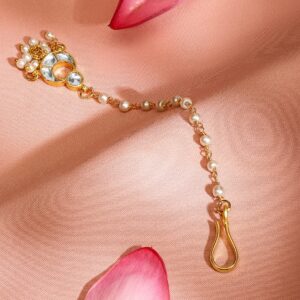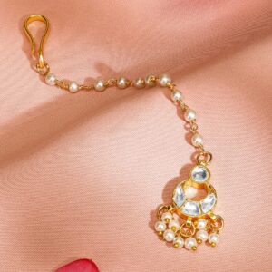 This 22K gold-plated maang tikka features a stunning Kundan studded pendant with delicate pearl bead embellishments, exuding traditional elegance. The pearl-beaded chain adds a graceful touch, making it a perfect adornment for weddings, festive occasions, and cultural celebrations. A timeless head jewellery piece for a regal and sophisticated look. Occasion : Bring your style to a whole new level with this handcrafted piece of jewellery. When you’re celebrating a special Occasion : – a birthday, wedding, festive or personal milestone – this piece adds that extra something that makes us feel special and looking our best. Material : & Care Dimension : Length 14 cm Material : Brass Weight : 4.78g Net Qnty : 1 Maang Tikka Care Label : It is advisable to avoid contact with water and organic chemicals i.e. perfume sprays. Store jewellery in airtight box. After use, wipe the jewellery with soft cotton cloth.