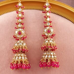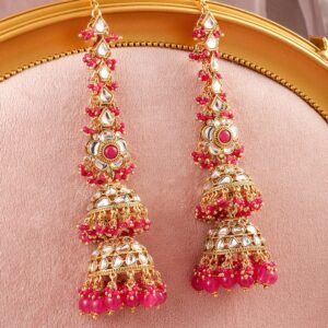 These 22K gold-plated earrings feature an long, full-ear covering design with kundan stones and pink beads. The triple-layer jhumka adds a statement look, perfect for weddings and special occasions. Occasion : Bring your style to a whole new level with this handcrafted piece of jewellery. When you’re celebrating a special Occasion : – a birthday, wedding, or personal milestone – this piece adds that extra something that makes us feel special and looking our best. Material : & Care Dimension : Size : Length : 7.5 cm, Width : 3.5 cm Material :Brass Weight : 84.95g Net Qnty : 1 Pair Earrings
