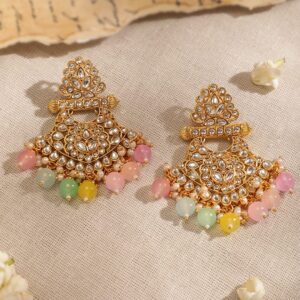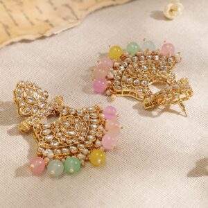 a vibrant and regal ensemble that adds a burst of color to your traditional look. This set features intricate Kundan detailing, adorned with multicoloured beads and a classic Chandbali motif, meticulously crafted in 22K gold-plated metal. Elevate your ethnic style with this handcrafted statement necklace set that seamlessly combines the richness of Kundan, the vibrancy of multicoloured beads, and the opulence of gold plating. Make a bold statement and showcase your unique style with this distinctive and eye-catching set. Material & Care Dimension : Length : 12 cm / 1.5 cm ; Width: 3.5 cm / 1.5 cm Net Weight : 23.16 Gram Material : Brass Collection : Kundan, Pearl & Beaded Net Quantity : 1 Necklace, 1 pair of Earrings and 1 Maangtikka Care Label : It is advisable to avoid contact with water and organic chemicals i.e. perfume sprays. Store jewellery in airtight box. After use, wipe the jewellery with soft cotton cloth.