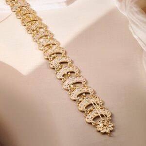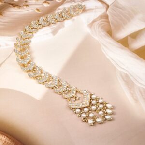 This stunning hair choti braid jewelry from is 22K gold plated, featuring intricate Kundan studded details and adorned with shiny pearl beads. Designed for brides or the wedding season, this regal accessory adds an elegant traditional charm to your bridal look, making it a perfect choice for special occasions. Material & Care Size : Length : 50 cm, Width : 4.5 cm Material : Brass Weight : 79.96g Net Qnty : 1 Hair Accessories Care Label: Wipe with a clean, dry cloth to remove dust