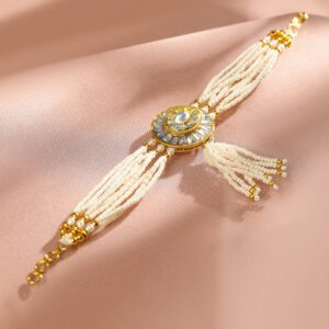 Bracelet : This 22K gold-plated statement bracelet features a stunning circular Kundan-studded centerpiece with delicate pearl bead strands and an elegant tassel detail. The intricate craftsmanship and traditional design make it a perfect accessory for weddings and festive occasions. Occasion : Bring your style to a whole new level with this handcrafted piece of jewellery. When you’re celebrating a special Occasion : – a birthday, wedding, or personal milestone – this piece adds that extra something that makes us feel special and looking our best. Material : & Care Dimension : Length : 16 cm, Width: 2.5 cm Net Weight: 15.65 g Net Quantity : 1 Bracelet Material :Brass Care Label : It is advisable to avoid contact with water and organic chemicals i.e. perfume sprays. Store jewellery in airtight box. After use, wipe the jewellery with soft cotton cloth.