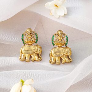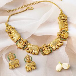 This 22K gold-plated temple jewellery set features exquisite Lakshmi and elephant motifs, symbolizing divinity and strength. Accented with intricate and cubic zirconia stones detailing and a regal design, its perfect for weddings and traditional celebrations. Includes matching earrings. Material & Care Dimension : Length : Necklace : 24 cm ; Earrings : 2.5 cm Width : Necklace : 3.9 cm ; Earrings : 2.5 cm Material: Brass Collections : Temple Net Weight: 38 Gram Net Quantity: 1 Necklace & 1 Pair of Earrings Care Label: It is advisable to avoid contact with water and organic chemicals i.e. perfume sprays. Store jewellery in airtight box. After use, wipe the jewellery with soft cotton cloth.