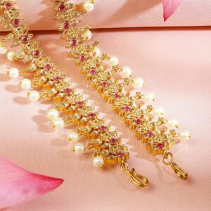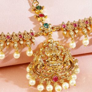 This 22K gold-plated bridal matha patti features a divine Lakshmi motif at the center, accented with ruby red and emerald green stones and bordered with pearl drops. Ideal for women & girls for weddings and traditional celebrations. Occasion : Bring your style to a whole new level with this handcrafted piece of jewellery. When you’re celebrating a special Occasion : – a birthday, wedding, festive or personal milestone – this piece adds that extra something that makes us feel special and looking our best. Material & Care Dimension : Length : 18 cm, Width: 3 cm Net Weight: 42.80 Gram Net Quantity : 1 Head Jewellery Material : Brass Care Label : It is advisable to avoid contact with water and organic chemicals i.e. perfume sprays. Store jewellery in airtight box. After use, wipe the jewellery with soft cotton cloth.