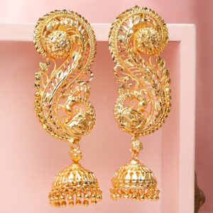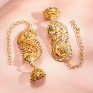 These 22K gold-plated oversized ear-cuff jhumka earrings feature a detailed leaf filigree pattern and dome-shaped jhumkas with ghungroo accents, ideal for women & girls for weddings and festive wear. Material & Care Dimension : Length: 8 cm Dimension : Width: 2.5 cm Net Weight : 26.74 Gram Net Quantity : 1 pair of Ear cuff Earrings Material : Brass Care Label : It is advisable to avoid contact with water and organic chemicals i.e. perfume sprays. Store jewellery in airtight box. After use, wipe the jewellery with soft cotton cloth.