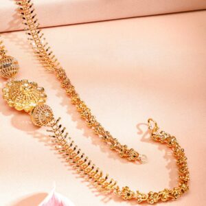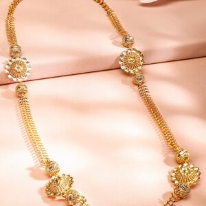 Necklace & Chains : A stunning 22K gold-plated necklace featuring intricately designed floral pendants and elegant gold chain. Perfect for weddings, festive occasions & traditional celebrations, adding a royal touch. Occasion : Bring your style to a whole new level with this handcrafted piece of jewelry. When you’re celebrating a weddings, festive occasions & traditional ceremonies, this piece adds that extra something that makes us feel special and looking our best. Material & Care Dimension : Length Size : Necklace : 43 cm Dimension : Width : Necklace : 2.5 cm Net Quantity : 1 Necklace Net Weight: 60.37 g Material : Brass Care Label : It is advisable to avoid contact with water and organic chemicals i.e. perfume sprays. Store jewellery in airtight box. After use, wipe the jewellery with soft cotton cloth.