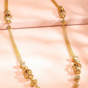 Necklace & Chains : A 22K gold-plated handcrafted long necklace featuring intricately detailed gold beads with a regal layered design. A perfect jewelry piece for weddings, festive occasions & traditional celebrations. Occasion : Bring your style to a whole new level with this handcrafted piece of jewelry. When you’re celebrating a weddings, festive occasions & traditional ceremonies, this piece adds that extra something that makes us feel special and looking our best. Material & Care Dimension : Length Size : Necklace : 60 cm Dimension : Width : Necklace : 2 cm Net Quantity : 1 Necklace Net Weight: 71.92 g Material : Brass Care Label : It is advisable to avoid contact with water and organic chemicals i.e. perfume sprays. Store jewellery in airtight box. After use, wipe the jewellery with soft cotton cloth.