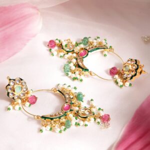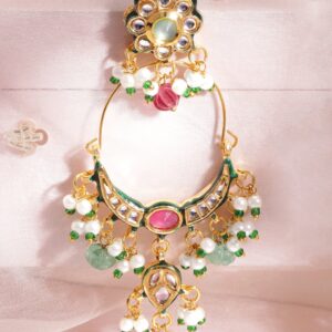22K gold-plated chandbali earrings adorned with multicolor stones, kundan, pearls, and beads, crafted in a traditional design for weddings, festive, and party wear elegance. Perfect for Weddings: Whether styled with a lehenga or saree, these earrings are a perfect choice for brides, bridesmaids, or guests attending traditional functions, haldi, mehendi, and wedding celebrations. Material & Care Dimension : Length : 10 cm Width : 3.5 cm Material : Brass Weight : 31.29 gram Net Qnty : 1 Pair Earrings Collection : Kundan, Pearls & Beads Care Label : It is advisable to avoid contact with water and organic chemicals i.e. perfume sprays. Store jewellery in airtight box. After use, wipe the jewellery with soft cotton cloth.