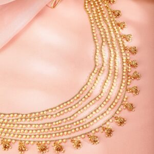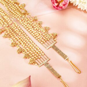 Saree Accessories : This 22k gold-plated handcrafted kamarbandh features five layers of delicate white pearl beads and gold-toned embellishments, creating a regal and traditional accessory ideal for bridal and festive ensembles. Occasion : Bring your style to a whole new level with this handcrafted piece of jewellery. When you’re celebrating a special Occasion : – a birthday, wedding, or personal milestone – this piece adds that extra something that makes us feel special and looking our best. Material : & Care Dimension : Length : 54 cm, Width: 3.5 cm Net Weight: 137 g Net Quantity : 1 Saree Accessories Material :Brass Care Label : It is advisable to avoid contact with water and organic chemicals i.e. perfume sprays. Store jewellery in airtight box. After use, wipe the jewellery with soft cotton cloth.