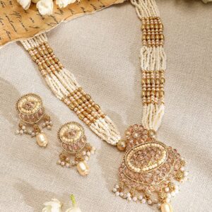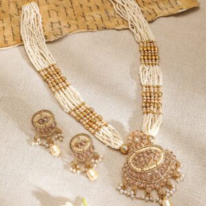 Jewellery Set : ‘ gold-plated white multi-strand pearl beaded necklace set, adorned with kundan and pearl drop accents, exudes traditional elegance, making it perfect for grand celebrations and weddings. Occasion : Bring your style to a whole new level with this handcrafted piece of jewellery. When you’re celebrating a special Occasion : – a birthday, wedding, or personal milestone – this piece adds that extra something that makes us feel special and looking our best. Material : & Care Dimension : Length : NS- 60 ; E- 4.6 cm, Width: NS- 8 ; E- 2.1 W Net Quantity : 1 Necklace & 2 Earrings Net Weight: 75.94 g Material :Brass Care Label : It is advisable to avoid contact with water and organic chemicals i.e. perfume sprays. Store jewellery in airtight box. After use, wipe the jewellery with soft cotton cloth.