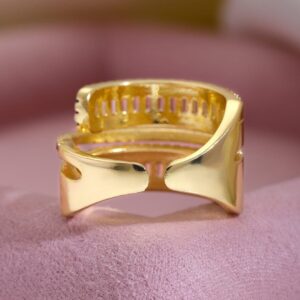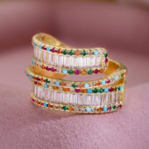 Rings : This Voguish exquisite Voguish adjustable ring is a statement of vibrant elegance, featuring a stunning array of multicolor AD & Cubic Zirconia stones meticulously studded across the band. The 22K gold plating enhances its luxurious appeal, making it a versatile piece that can be adjusted to fit any finger comfortably. The intricate design and the colorful sparkle make This Voguish ring a standout accessory, perfect for adding a pop of color and sophistication to your look. Occasion : Bring your style to a whole new level with this handcrafted piece of jewellery. When you’re celebrating a special Occasion : – a birthday, wedding, or personal milestone – this piece adds that extra something that makes us feel special and looking our best. Material : & Care Dimension : Size :Length : 6.5 cm, Width : 1.5 cm Material :Brass Care Label : It is advisable to avoid contact with water and organic chemicals i.e. perfume sprays. Store jewellery in airtight box. After use, wipe the jewellery with soft cotton cloth.