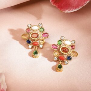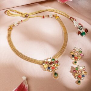 Jewellery Set : This 22K gold-plated necklace set is adorned with vibrant multicolor gemstones, featuring a statement floral-inspired design. Paired with matching earrings, it is perfect for festive & traditional occasions. Occasion : Bring your style to a whole new level with this handcrafted piece of jewellery. When you’re celebrating a special Occasion : – a birthday, wedding, or personal milestone – this piece adds that extra something that makes us feel special and looking our best. Material : & Care Dimension : Size : Necklace : 14 cm, Earrings : 3 cm Net Quantity : 1 Necklace & 2 Earrings Net Weight: 24.03 g Material :Brass Care Label : It is advisable to avoid contact with water and organic chemicals i.e. perfume sprays. Store jewellery in airtight box. After use, wipe the jewellery with soft cotton cloth.