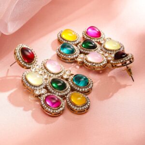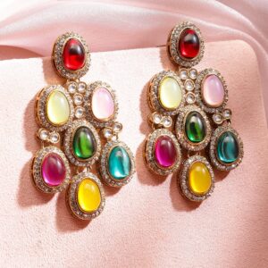 Be the first to review “22K Gold-Plated Multicolor Triangle Stone & Cubic Zirconia Studded Chandelier Earrings for Women – Premium Designer Jewelry”