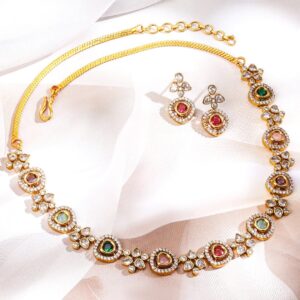 This 22K gold-plated floral vine necklace set features ruby pink, emerald green, and blue sapphire stones with white Cubic Zirconia, making it perfect for festive and traditional dressing. Perfect for Occasions: Ideal for festive events, weddings, and traditional gatherings, this necklace set pairs beautifully with lehengas, sarees, and anarkalis for a show-stopping ethnic look. Material & Care Dimension : Length – Necklace : 22.4 cm ; Earrings : 1.4 cm Width – Necklace : 2.5 cm ; Earrings : 2.5 cm Material : Brass Collection : Gold with AD/ Cubic Zirconia Weight : 24.81 Gram Net Qnty : 1 Necklace & 1 Pair of Earrings Care Label : It is advisable to avoid contact with water and organic chemicals i.e. perfume sprays. Store jewellery in airtight box. After use, wipe the jewellery with soft cotton cloth.