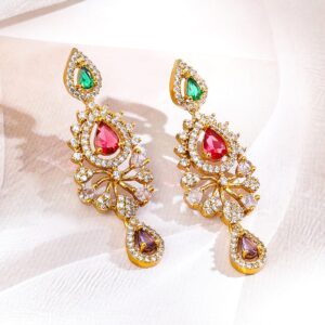 This 22K gold-plated necklace set features ruby red, emerald green, amethyst purple, pastel blue, and blush pink stones with white cubic zirconia in floral-vine motifs and matching earrings—ideal for festive and bridal looks for women & girls. Material & Care Dimension : Length – Necklace : 12.8 cm ; Earrings : 3.5 cm Width – Necklace : 2.5 cm ; Earrings : 2.5 cm Material : Brass Collection : Gold with AD/ Cubic Zirconia Weight : 30.37 Gram Net Qnty : 1 Necklace & 1 Pair of Earrings Care Label : It is advisable to avoid contact with water and organic chemicals i.e. perfume sprays. Store jewellery in airtight box. After use, wipe the jewellery with soft cotton cloth.