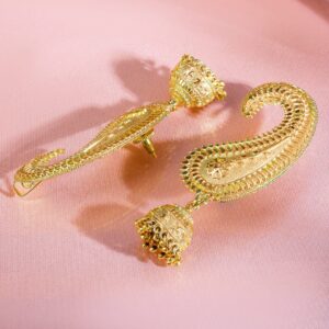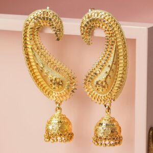 These 22K gold-plated oversized ear-cuff jhumka earrings feature an intricately detailed paisley design with a bold ghungroo dome drop, perfect for weddings and festive styling for women & girls. Material & Care Dimension : Length: 7 cm Dimension : Width: 3.5 cm Net Weight : 42 Gram Net Quantity : 1 pair of Ear cuff Earrings Material : Brass Care Label : It is advisable to avoid contact with water and organic chemicals i.e. perfume sprays. Store jewellery in airtight box. After use, wipe the jewellery with soft cotton cloth.