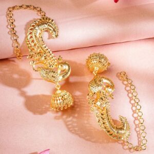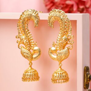 These 22K gold-plated oversized ear-cuff jhumka earrings feature a sculpted peacock motif with intricate detailing and dome-shaped ghungroo drops, ideal for weddings and festive styling for women & girls. Material & Care Dimension : Length: 9 cm Dimension : Width: 3 cm Net Weight : 29.47 Gram Net Quantity : 1 pair of Ear cuff Jhumka Earrings Material : Brass Care Label : It is advisable to avoid contact with water and organic chemicals i.e. perfume sprays. Store jewellery in airtight box. After use, wipe the jewellery with soft cotton cloth.