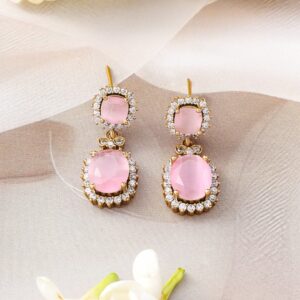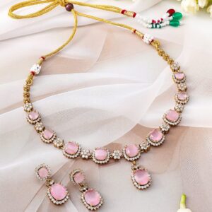 Showcasing a 22K gold-plated necklace set adorned with pastel pink stones and sparkling cubic zirconia, complemented by matching earrings. A graceful piece for adding elegance to traditional or modern looks. Material : & Care Dimension : Necklace & Earrings : 13 cm / 3 cm Width : 2 cm / 2 cm Material: Brass Net Weight: 31.28 Gram Net Quantity: 1 Necklace & 1 Pair of Earrings Care Label: It is advisable to avoid contact with water and organic chemicals i.e. perfume sprays. Store jewellery in airtight box. After use, wipe the jewellery with soft cotton cloth.