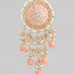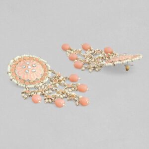 Earrings : Adorn yourself with these stunning gold-plated dangle earrings, featuring a beautiful combination of peach and white beads along with delicate pearl accents. The earrings are intricately designed with AD stone studs, adding a touch of sparkle to the soft peach tones. The cascading beaded design creates a mesmerizing effect, perfect for enhancing your ethnic and traditional looks. These earrings are a must-have for women who love to make a statement with their jewelry, blending elegance with a contemporary flair. Occasion : Bring your style to a whole new level with this handcrafted piece of jewellery. When you’re celebrating a special Occasion : – a birthday, wedding, or personal milestone – this piece adds that extra something that makes us feel special and looking our best. Material : & Care Dimension : Size: Length : 10.5 cm, Width : 4 cm Material :Alloy Net Weight: 44 Gram Net Quantity: 1 Pair of Earrings Care Label: It is advisable to avoid contact with water and organic chemicals i.e. perfume sprays. Store jewellery in airtight box. After use, wipe the jewellery with soft cotton cloth.