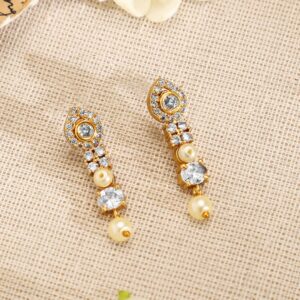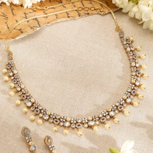 Jewellery Set : This exquisite handcrafted 22K gold-plated necklace set features elegant pearl beads and white cubic zirconia for a timeless, luxurious look. Occasion : Bring your style to a whole new level with this handcrafted piece of jewellery. When you’re celebrating a special Occasion : – a birthday, wedding, or personal milestone – this piece adds that extra something that makes us feel special and looking our best. Material : & Care Dimension : Length : NS = 22.5 cm ; E = 1.5 cm, Width: NS = 2.9 cm ; E = 0.7 cm Net Weight: 29,30 g Net Quantity : 1 Necklace & 2 Earrings Material :Brass Care Label : It is advisable to avoid contact with water and organic chemicals i.e. perfume sprays. Store jewellery in airtight box. After use, wipe the jewellery with soft cotton cloth.
