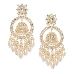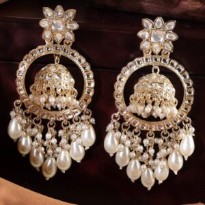 Adorn your ears with the enchanting charm of our 22K gold-plated jhumka earrings, featuring lustrous pearls and intricate Kundan detailing that gracefully cascade with every movement. The harmonious design exudes elegance and opulence, perfect for making a statement. Embrace the captivating allure of these earrings, allowing the pearls and Kundan embellishments to sway gracefully and enhance your style with a touch of refined beauty. Let the 22K gold plating and delicate details create an aura of timeless charm and exquisite allure, making a bold statement of sophistication and luxurious grace. Material & Care Dimension : Length 5.5 cm Material: Brass Net Weight: 46 Gram Net Quantity: 1 Pair of Earrings Care Label: It is advisable to avoid contact with water and organic chemicals i.e. perfume sprays. Store jewellery in airtight box. After use, wipe the jewellery with soft cotton cloth.