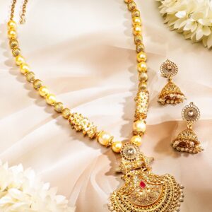 This 22K gold-plated temple jewellery set features an intricately designed pendant adorned with a striking ruby red stone, enhanced by golden and pearl beads. The matching jhumka earrings mirror the regal charm with delicate pearl embellishments. A masterpiece of heritage craftsmanship, perfect for weddings, festive occasions, and cultural celebrations. Occasion : Bring your style to a whole new level with this handcrafted piece of jewellery. When you’re celebrating a special Occasion : – a birthday, wedding, festive or personal milestone – this piece adds that extra something that makes us feel special and looking our best. Material & Care Dimension : Necklace 60 cm, Earrings 5 cm Material : Brass Care Label : It is advisable to avoid contact with water and organic chemicals i.e. perfume sprays. Store jewellery in airtight box. After use, wipe the jewellery with soft cotton cloth