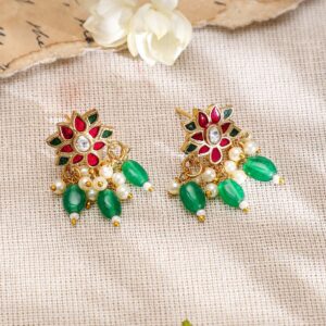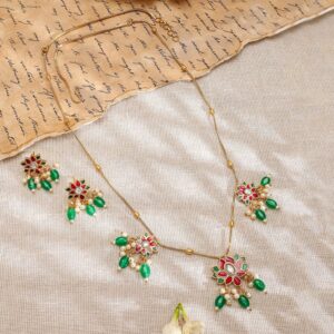 A traditional 22K gold-plated necklace set adorned with vibrant pink and green stones, and pearl drops. Comes with matching earrings, perfect for adding elegance to your jewelry collection. Material : & Care Dimension : Length: 23 cm / 1 cm Width : 3 cm / 1.5 cm Material: Brass Net Weight: 19.15 Gram Net Quantity: 1 Necklace & 1 Pair of Earrings Care Label: It is advisable to avoid contact with water and organic chemicals i.e. perfume sprays. Store jewellery in airtight box. After use, wipe the jewellery with soft cotton cloth.