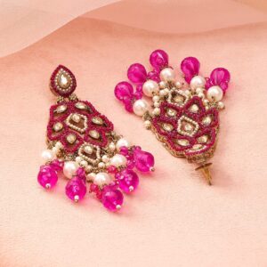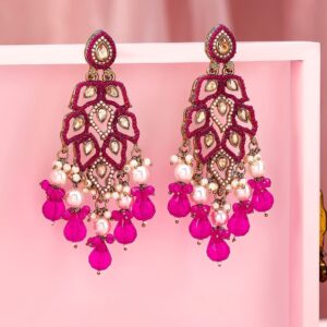 22K gold-plated chandelier earrings feature intricate pink stone and Kundan studding, enhanced with luxurious pearl and bead drops, creating a stunning layered design for a regal look. Perfect for Special Occasions : These chandelier earrings are ideal for weddings, festivals, and cultural events, making a bold and stylish statement. Material & Care Length : 10 cm ; Width : 3 cm Material : Brass Net Weight : 35.50 Gram Net Quantity : 1 Pair of Earrings Care Label : It is advisable to avoid contact with water and organic chemicals i.e. perfume sprays. Store jewellery in airtight box. After use, wipe the jewellery with soft cotton cloth.