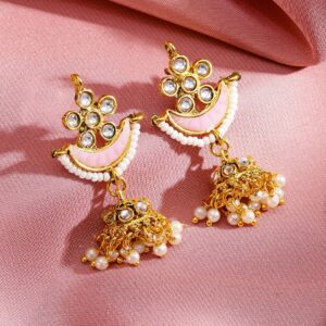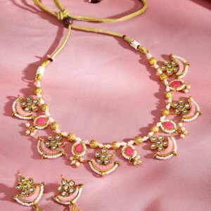 Jewellery Set : A mesmerizing 22K gold-plated choker necklace set featuring intricate pink and white enamel work with Kundan-studded detailing. Embellished with pearl beads for a regal touch, this handcrafted set comes with matching earrings, making it a perfect choice for festive and wedding occasions. Occasion : Bring your style to a whole new level with this handcrafted piece of jewellery. When you’re celebrating a special Occasion : – a birthday, wedding, or personal milestone – this piece adds that extra something that makes us feel special and looking our best. Material : & Care Dimension : Net Weight: 36.50 g Net Quantity : 1 Necklace & 2 Earrings Material :Brass Care Label : It is advisable to avoid contact with water and organic chemicals i.e. perfume sprays. Store jewellery in airtight box. After use, wipe the jewellery with soft cotton cloth.