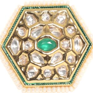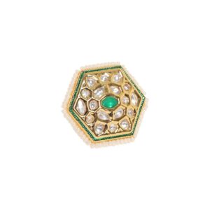 “Elevate your elegance with the 22k Gold Plated Polki Studded Finger Ring. Crafted to perfection, this exquisite ring showcases intricate detailing and shimmering Polki stones, all bathed in luxurious 22k gold plating. It’s a statement piece that effortlessly combines tradition and modernity, making it a perfect addition to your jewelry collection.” Occasion : Bring your style to a whole new level with this handcrafted piece of jewellery. When you’re celebrating a special Occasion : – a birthday, wedding, or personal milestone – this piece adds that extra something that makes us feel special and looking our best. Material & Care Dimension : Adjustable Material : Brass Weight : 10g Net Qnty : 1 Ring Care Label : It is advisable to avoid contact with water and organic chemicals i.e. perfume sprays. Store jewellery in airtight box. After use, wipe the jewellery with soft cotton cloth.