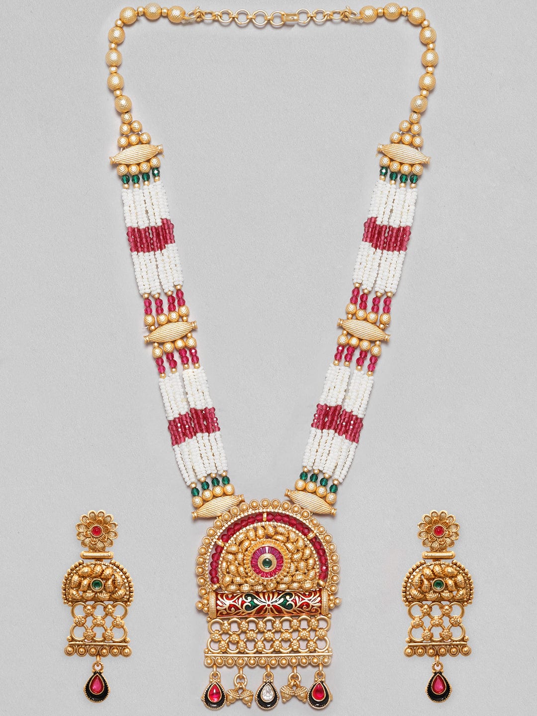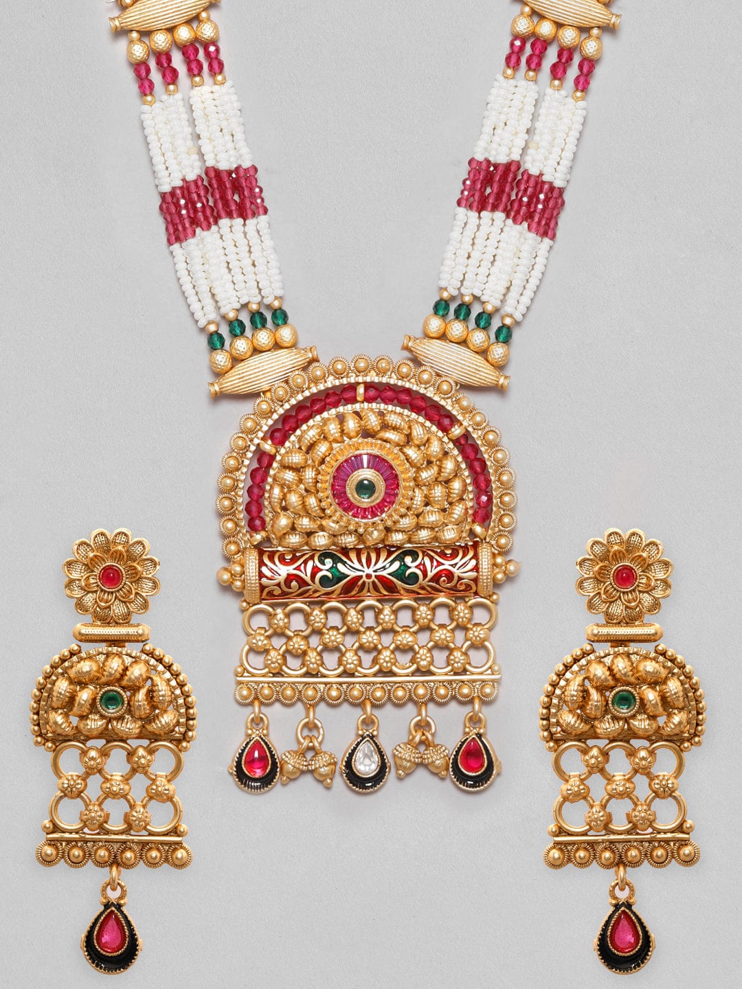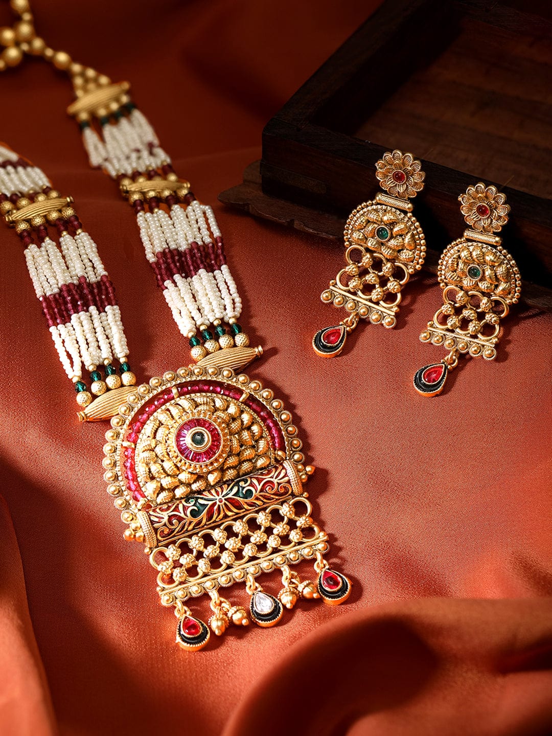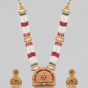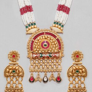 From minimalist to statement, our necklaces are multifaceted, always fashionable, and add a splash of personality to any wardrobe. Occasion : Bring your style to a whole new level with this handcrafted piece of jewellery. When you’re celebrating a special Occasion : – a birthday, wedding, or personal milestone – this piece adds that extra something that makes us feel special and looking our best. Material & Care Dimension : Necklace – 30 cm, Earrings – 6.5 cm Material : Brass Weight : 83g Net Qnty : 1 Necklace, 1 Pair of Earrings Care Label : It is advisable to avoid contact with water and organic chemicals i.e. perfume sprays. Store jewellery in airtight box. After use, wipe the jewellery with soft cotton cloth.