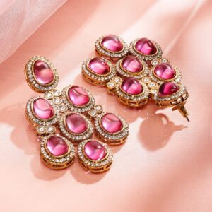 These luxurious 22K gold-plated chandelier earrings feature elegant rose pink oval stones surrounded by Cubic Zirconia stones, offering a stunning look. Perfect for adding glamour to any outfit, these premium earrings are designed for women who appreciate intricate craftsmanship and luxurious designs. Material & Care Dimension : Length: 7 cm Dimension : Width: 4.5 cm Net Weight : 37.6 Gram Net Quantity : 1 pair of Ear cuff Earrings Material : Brass Care Label : It is advisable to avoid contact with water and organic chemicals i.e. perfume sprays. Store jewellery in airtight box. After use, wipe the jewellery with soft cotton cloth.