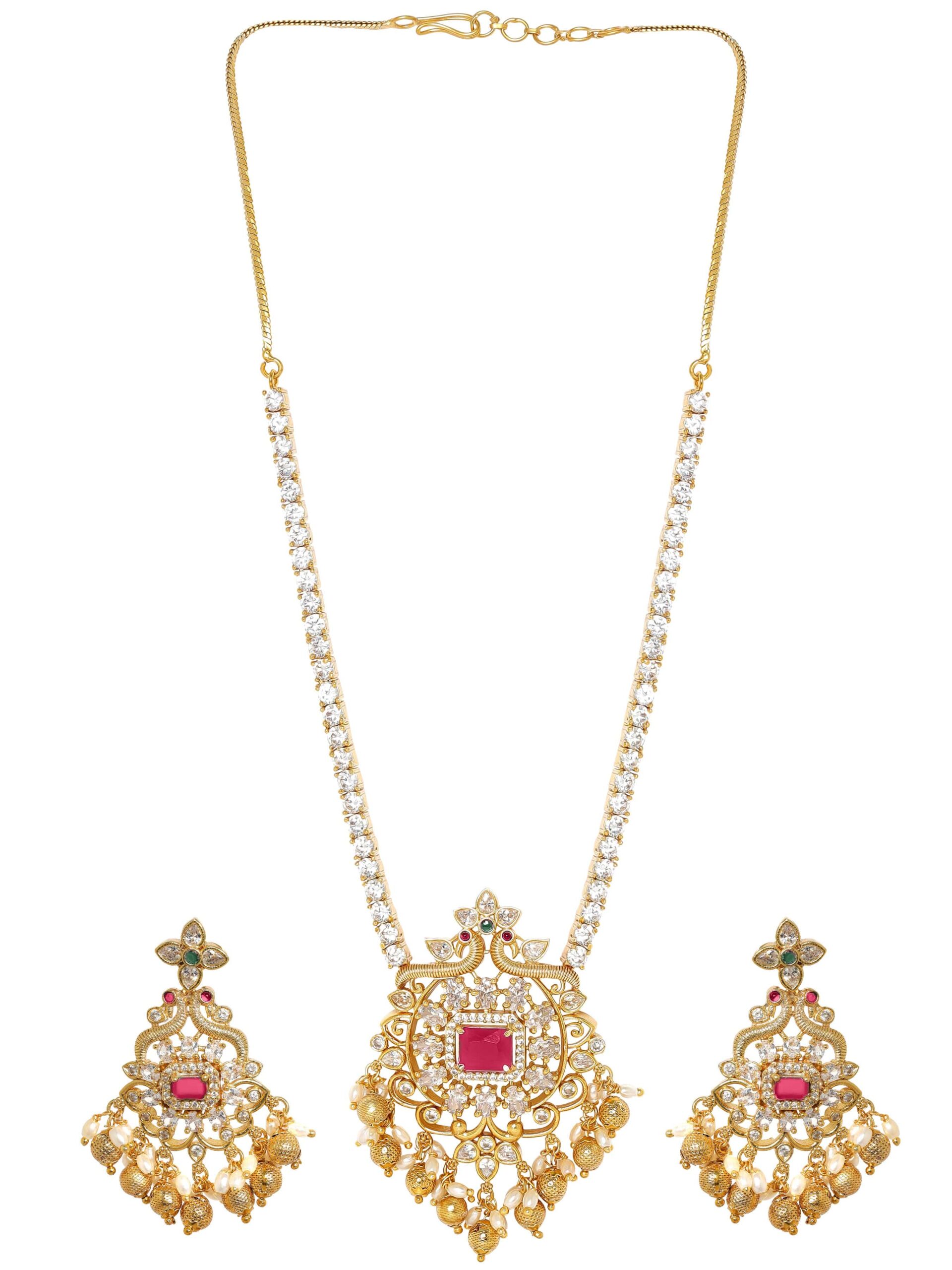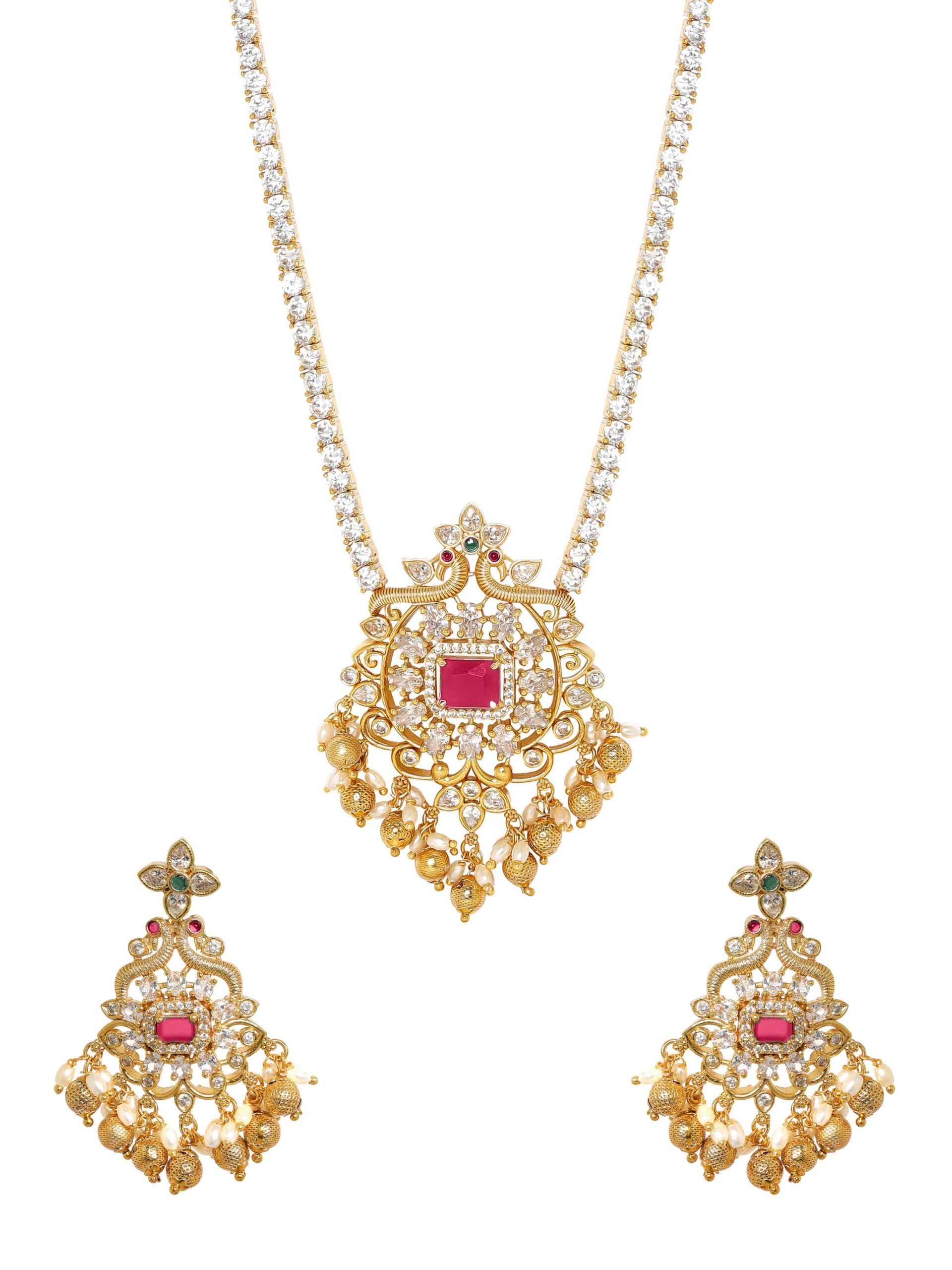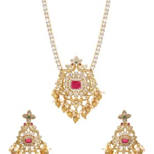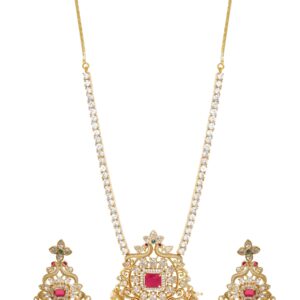 Experience regal elegance with ‘ 22K gold-plated jewellery set featuring ruby and cubic zirconia stones. Adorned with golden and pearl beads, this set includes a necklace and matching earrings, perfect for adding a touch of luxury. Occasion : Bring your style to a whole new level with this handcrafted piece of jewellery. When you’re celebrating a special Occasion : – a birthday, wedding, festive or personal milestone – this piece adds that extra something that makes us feel special and looking our best. Material & Care Dimension : Length : Necklace : 16 cm ; Earrings : 3 cm Width : Necklace : 4.5 cm ; Earrings : 2.5 cm Collection : Gold Plated with AD and Cubic Zicronia Material: Brass Net Weight: 46.46 Gram Net Quantity: 1 Necklace & 1 Pair of Earrings Care Label: It is advisable to avoid contact with water and organic chemicals i.e. perfume sprays. Store jewellery in airtight box. After use, wipe the jewellery with soft cotton cloth.
