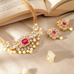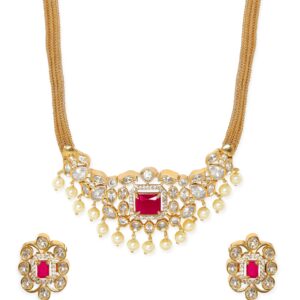 Necklace Set : Discover elegance with the Gold-Plated design, meticulously crafted for those who cherish luxury. This piece features Ruby and Emerald stones for an eye-catching sparkle, making it perfect for special occasions. With a blend of high-quality materials and exquisite design, it promises both durability and style. The versatile look can complement a variety of outfits, adding a touch of sophistication. A must-have for enhancing your accessory collection with timeless elegance. Occasion : Bring your style to a whole new level with this handcrafted piece of jewellery. When you’re celebrating a special Occasion : – a birthday, wedding, or personal milestone – this piece adds that extra something that makes us feel special and looking our best. Material : & Care Dimension : Length : 15 cm / 6.5 cm, Width: 3.3 cm / 1.8 cm Material: Brass Net Weight: 39.82 Gram Net Quantity: 1 Necklace & 1 Pair of Earrings Care Label: It is advisable to avoid contact with water and organic chemicals i.e. perfume sprays. Store jewellery in airtight box. After use, wipe the jewellery with soft cotton cloth.