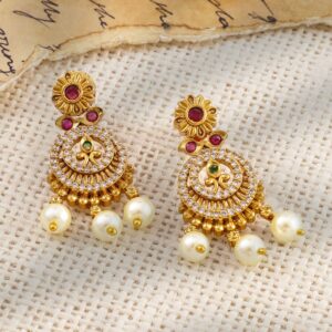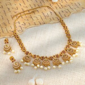 Jewellery Set: This 22K gold-plated temple necklace set is adorned with intricate detailing, ruby and green stones, and beautiful pearl drops. The perfect combination of traditional elegance for any festive look. Occasion : Bring your style to a whole new level with this handcrafted piece of jewellery. When you’re celebrating a special Occasion : – a birthday, festive, wedding, or personal milestone – this piece adds that extra something that makes us feel special and looking our best. Material : & Care Dimension : Length : NS = 13 cm ; E = 3.5 cm Width : NS = 3 cm ; E = 1.5 cm Material :Brass Net Quantity : 1 Necklace & 1 Pair of Earrings Care Label : It is advisable to avoid contact with water and organic chemicals i.e. perfume sprays. Store jewellery in airtight box. After use, wipe the jewellery with soft cotton cloth.