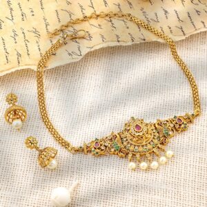 Jewellery Set : This 22K gold-plated choker necklace set features exquisite ruby, emerald, and cubic zirconia stones with elegant pearl drops. The intricate craftsmanship reflects traditional elegance and charm. Occasion : Bring your style to a whole new level with this handcrafted piece of jewellery. When you’re celebrating a special Occasion : – a birthday, wedding, or personal milestone – this piece adds that extra something that makes us feel special and looking our best. Material : & Care Dimension : Length : NS- 14; E- 3 cm, Width: NS- 4.5; E- 1.5 W Net Quantity : 1 Necklace & 2 Earrings Net Weight: 28.82 g Material :Brass Care Label : It is advisable to avoid contact with water and organic chemicals i.e. perfume sprays. Store jewellery in airtight box. After use, wipe the jewellery with soft cotton cloth.