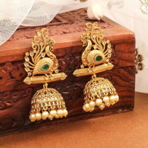Earrings : These 22K gold-plated jhumkas feature intricate temple-inspired peacock motifs adorned with ruby pink, emerald and cubic zirconia stones. The earrings are finished with elegant pearl drops for a regal look. Occasion : Bring your style to a whole new level with this handcrafted piece of jewellery. When you’re celebrating a special Occasion : – a birthday, wedding, festive or personal milestone – this piece adds that extra something that makes us feel special and looking our best. Material : & Care Dimension : Size : Length : 6 cm, Width : 3 cm Material: Brass Net Weight: 26,64 Gram Net Quantity: 1 Pair of Earrings Care Label: It is advisable to avoid contact with water and organic chemicals i.e. perfume sprays. Store jewellery in airtight box. After use, wipe the jewellery with soft cotton cloth.