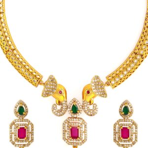 Jewellery Set : This stunning 22K gold-plated necklace set features a unique design with intricate elephant motifs, symbolizing strength and grace. Adorned with radiant ruby and emerald stones, the necklace is a perfect blend of traditional charm and modern elegance. The matching earrings mirror the necklace’s design, completing the set with a harmonious touch. Ideal for adding a regal touch to your attire, this necklace set is a must-have for any jewelry collection, perfect for special occasions and celebrations. Occasion : Bring your style to a whole new level with this handcrafted piece of jewellery. When you’re celebrating a special Occasion : – a birthday, wedding, or personal milestone – this piece adds that extra something that makes us feel special and looking our best. Material : & Care Dimension : Size : Length : 14 cm, Width : 4 cm Material: Brass Net Weight: 33.18 Gram Net Quantity: 1 Necklace & 1 Pair of Earrings Care Label: It is advisable to avoid contact with water and organic chemicals i.e. perfume sprays. Store jewellery in airtight box. After use, wipe the jewellery with soft cotton cloth.