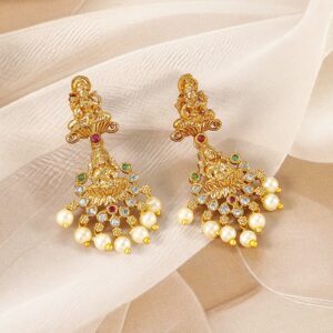 Celebrate the divine with this exquisite 22K gold-plated temple necklace set, featuring an intricate Laxmi motif. This luxurious set is adorned with rich Ruby, Emerald, and CZ stones, complemented by lustrous pearl beads that add a touch of elegance. The set includes a beautifully crafted necklace and matching earrings, perfect for embracing traditional aesthetics. A perfect choice for weddings and festive occasions, this divine Laxmi temple necklace set showcases the timeless allure of temple jewellery, blending cultural heritage with contemporary style. Material : & Care Dimension : Necklace Length:13 cm / 6 cm width : 4 cm / 1.9 cm Material : Brass Care Label : It is advisable to avoid contact with water and organic chemicals i.e. perfume sprays. Store jewellery in airtight box. After use, wipe the jewellery with soft cotton cloth.