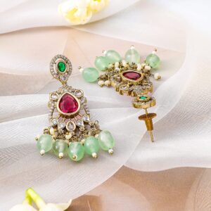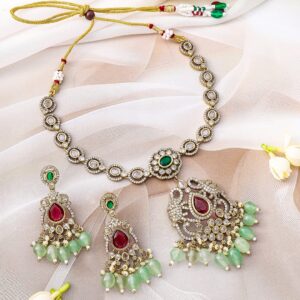 Jewellery Set : This 22K gold-plated necklace set is adorned with ruby pink and emerald green stones, Kundan and cubic zirconia detailing, paired with mint green beads. The exquisite craftsmanship highlights a traditional design that perfectly complements ethnic and festive ensembles. A complete set with matching earrings that exudes elegance. Occasion : Bring your style to a whole new level with this handcrafted piece of jewellery. When you’re celebrating a special Occasion : – a birthday, wedding, or personal milestone – this piece adds that extra something that makes us feel special and looking our best. Material : & Care Dimension : Length : NS- 17 ; E- 5.5 cm, Width: NS- 3.5 ; E- 1.8 W Net Weight: 54.82 g Net Quantity : 1 Necklace & 2 Earrings Material :Brass Care Label : It is advisable to avoid contact with water and organic chemicals i.e. perfume sprays. Store jewellery in airtight box. After use, wipe the jewellery with soft cotton cloth.