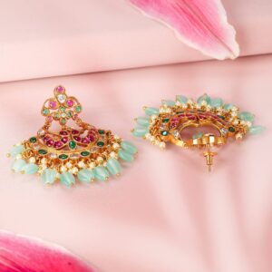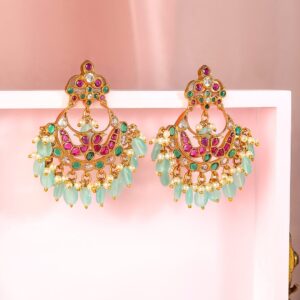 Earrings : These 22K gold-plated chandbali earrings feature vibrant ruby and emerald stones with delicate mint-green beads. Designed with intricate craftsmanship, they add a statement finish to your ethnic attire. Occasion : Bring your style to a whole new level with this handcrafted piece of jewellery. When you’re celebrating a special Occasion : – a birthday, wedding, or personal milestone – this piece adds that extra something that makes us feel special and looking our best. Material : & Care Dimension : Length : 4 cm, Width : 4 cm Material :Brass Care Label : It is advisable to avoid contact with water and organic chemicals i.e. perfume sprays. Store jewellery in airtight box. After use, wipe the jewellery with soft cotton cloth.