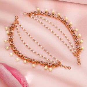 Ear Chain : Exquisitely handcrafted, this 22K gold-plated ear chain showcases ruby and green stone accents with delicate pearl beaded layers. Its intricate design enhances ethnic looks, making it a versatile accessory for festive and bridal attire. Occasion : Bring your style to a whole new level with this handcrafted piece of jewellery. When you’re celebrating a special Occasion : – a birthday, festive, wedding, or personal milestone – this piece adds that extra something that makes us feel special and looking our best. Material : & Care Dimension : Length : 13 cm ; Width : 1.5 cm Material: Brass Net Weight: 29.23 Gram Net Quantity: 1 Pair of Earrings Care Label: It is advisable to avoid contact with water and organic chemicals i.e. perfume sprays. Store jewellery in airtight box. After use, wipe the jewellery with soft cotton cloth.
