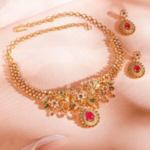Jewellery Set : This 22K gold-plated handcrafted necklace set features ruby pink and emerald green cubic zirconia stones, intricately arranged with golden filigree detailing and delicate embellishments. A regal choice for weddings and festive occasions, radiating elegance and opulence. Occasion : Bring your style to a whole new level with this handcrafted piece of jewellery. When you’re celebrating a special Occasion : – a birthday, wedding, or personal milestone – this piece adds that extra something that makes us feel special and looking our best. Material : & Care Dimension : Size : Necklace : 17 cm, Earrings : 3 cm Net Quantity : 1 Necklace & 2 Earrings Net Weight: 38.07 g Material :Brass Care Label : It is advisable to avoid contact with water and organic chemicals i.e. perfume sprays. Store jewellery in airtight box. After use, wipe the jewellery with soft cotton cloth.