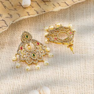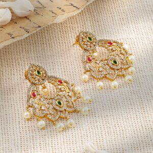 Earrings : These 22K gold-plated chandbali earrings feature intricate ruby pink, emerald, and cubic zirconia detailing with pearl accents. A perfect blend of elegance and tradition for a graceful look. Occasion : Bring your style to a whole new level with this handcrafted piece of jewellery. When you’re celebrating a special Occasion : – a birthday, wedding, or personal milestone – this piece adds that extra something that makes us feel special and looking our best. Material : & Care Dimension : Length : 5.2 cm, Width : 3.5 cm Material: Brass Net Weight: 18, 60 Gram Net Quantity: 1 Pair of Earrings Care Label: It is advisable to avoid contact with water and organic chemicals i.e. perfume sprays. Store jewellery in airtight box. After use, wipe the jewellery with soft cotton cloth.