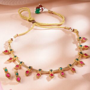 Necklace Set : This 22K gold-plated necklace set features ruby pink and emerald green teardrop stones suspended from a golden textured chain. Paired with matching earrings, it’s ideal for weddings, festivities, and traditional wear. Occasion & Versatility: Ideal for weddings, cultural ceremonies, and festive wear, this necklace set elevates any saree or lehenga ensemble. Its adjustable fit and vibrant gemstones make it a versatile and elegant addition to premium jewelry collections. Material : & Care Dimension : Length : NS = 23 cm ; E = 2 cm Width: NS = 2 cm ; E = 0.8 cm Material: Brass Net Weight: 27.16 Gram Net Quantity: 1 Necklace & 1 Pair of Earrings Care Label: It is advisable to avoid contact with water and organic chemicals i.e. perfume sprays. Store jewellery in airtight box. After use, wipe the jewellery with soft cotton cloth.
