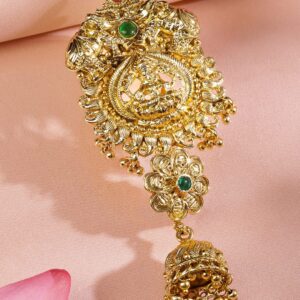 Hair Accessories : This 22K gold-plated temple braid hair accessory features a divine Lakshmi motif, ruby pink and emerald green stones, floral detailing, and a traditional jhumka drop for a majestic bridal look. Occasion : Bring your style to a whole new level with this handcrafted piece of jewellery. When you’re celebrating a special Occasion : – a birthday, wedding, festive or personal milestone – this piece adds that extra something that makes us feel special and looking our best. Material & Care Dimension : Size : Length : 10 cm ,Width : 4 cm Material : Brass Net Weight : 36.13 Gram Net Quantity : 1 Hair Accessories Care Label : It is advisable to avoid contact with water and organic chemicals i.e. perfume sprays. Store jewellery in airtight box. After use, wipe the jewellery with soft cotton cloth.